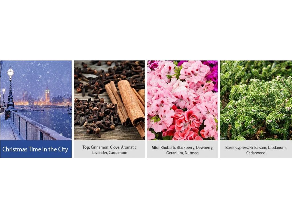 Svěží parfémová vůně s akcenty hřebíčku, levandule, kardamonu, pelargónie a cypřišů s jedlovou pryskyřicí. Svíčka svojí vůní skvěle vystihuje energii blížících se svátků v pulzujícím velkoměstě.