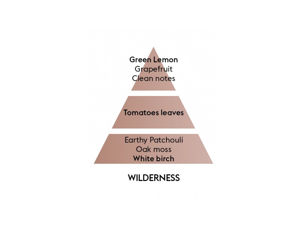 Interiérový parfém Divočina vás získá svou silnou podmanivou vůní. Ve svých vysokých tónech mísí vůně grepu, limetky s tóny čistoty. Zemitost parfému ucítíte prvně již ve středních tónech díky rajčatovým listům. Pačuli a bílé březové dřevo v nízkých tónech vyjadřují dobrodružný charakter parfému, zatímco mech uvolňuje silnou mužskou smyslnost.