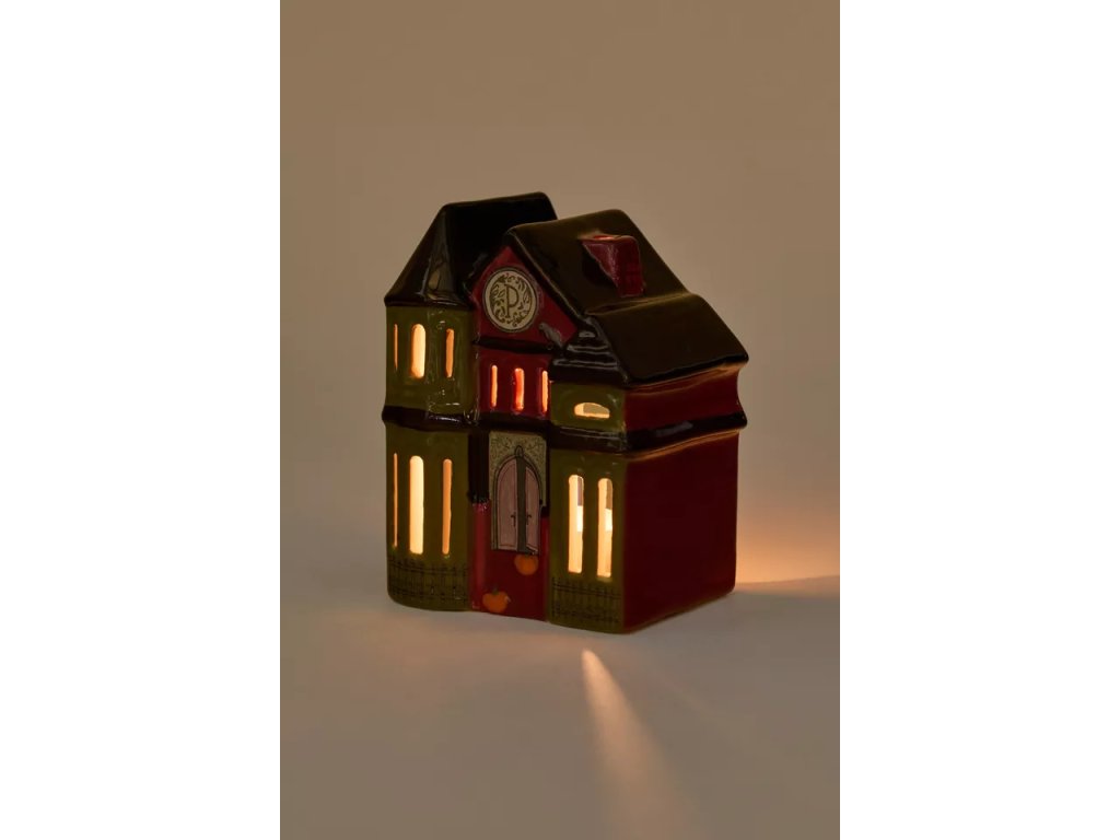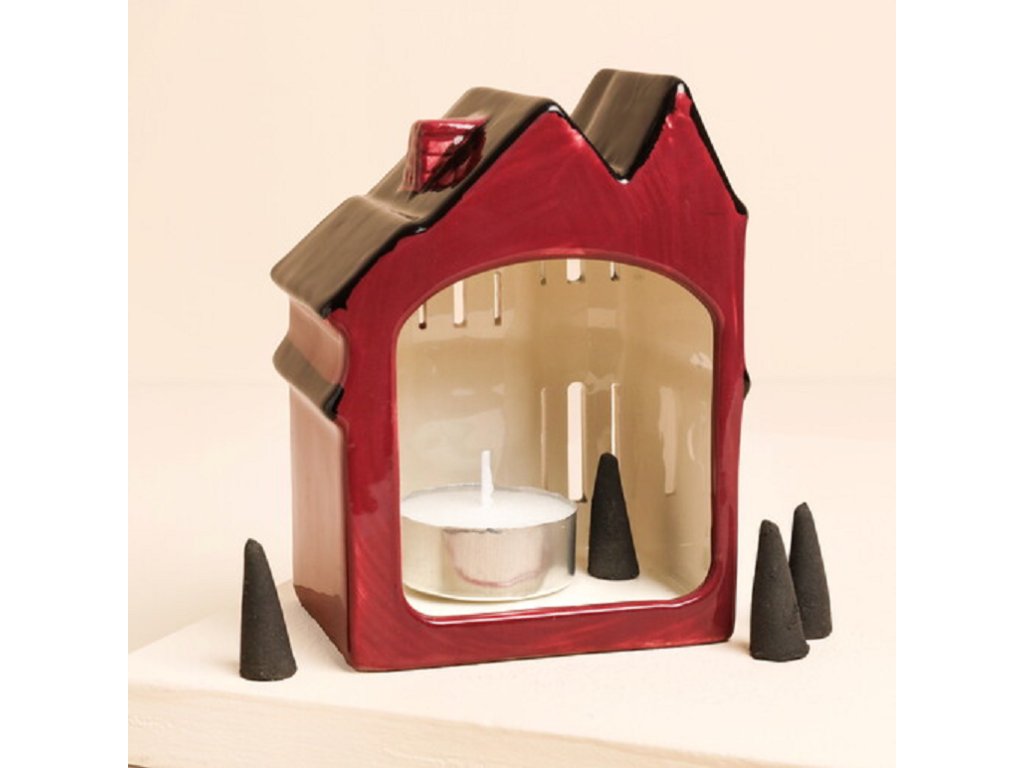 Keramický domeček v designu strašidelného domu Mystic Manor najde dvojí využití ve Vašem interiéru. Sada obsahuje dvacet kadidlových kuželů, které po zapálení vydávají voňavý dřevitý kouř. Umístěte kužel do domečku a sledujte pomalu se linoucí kouř z jeho komína. V případě že nechcete žádnou vůni, umístěte do domečku přiloženou čajovou svíčku, díky které se domeček promění ve svícen, jehož teplé světlo z oken bude vyzařovat útulnou atmosféru. Keramický domeček je glazovaný a ručně malovaný. Vonné kužely obsahují vůni dřeva PALO SANTO, jež je silně meditační a připomíná nasládlou vůni kokosu.