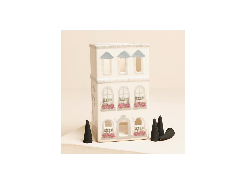 Keramický domeček v designu pařížškého domu najde dvojí využití ve Vašem interiéru. Sada obsahuje dvacet kadidlových kuželů, které po zapálení vydávají voňavý dřevitý kouř. Umístěte kužel do domečku a sledujte pomalu se linouc kouř z jeho komína. V případě že nechcete žádnou vůni, umístěte do domečku přiloženou čajovou svíčku, díky které se domeček promění ve svícen, jehož teplé světlo z oken bude vyzařovat útulnou atmosféru. Keramický domeček je glazovaný a ručně malovaný. Vonné kužely obsahují vůni dřeva PALO SANTO, jež je silně meditační a připomíná nasládlou vůni kokosu.