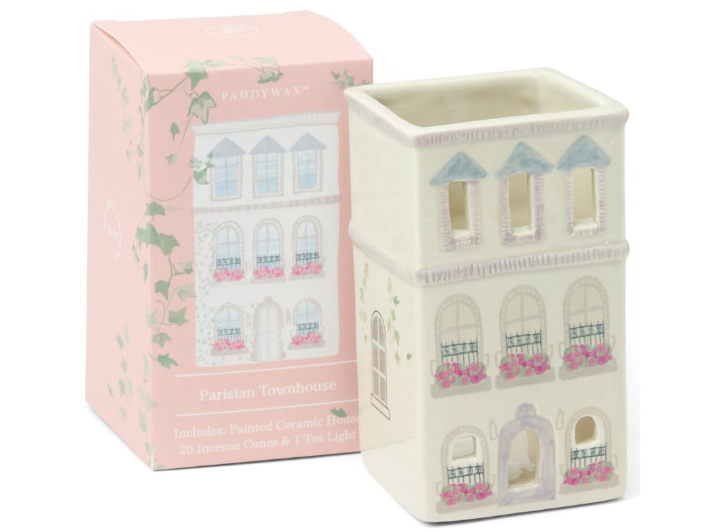 PADDYWAX - keramický domeček PARISIAN TOWNHOUSE + 20 kadidlových kuželů PALO SANTO a čajová svíčka