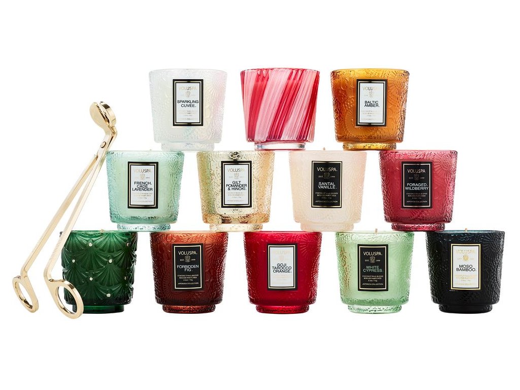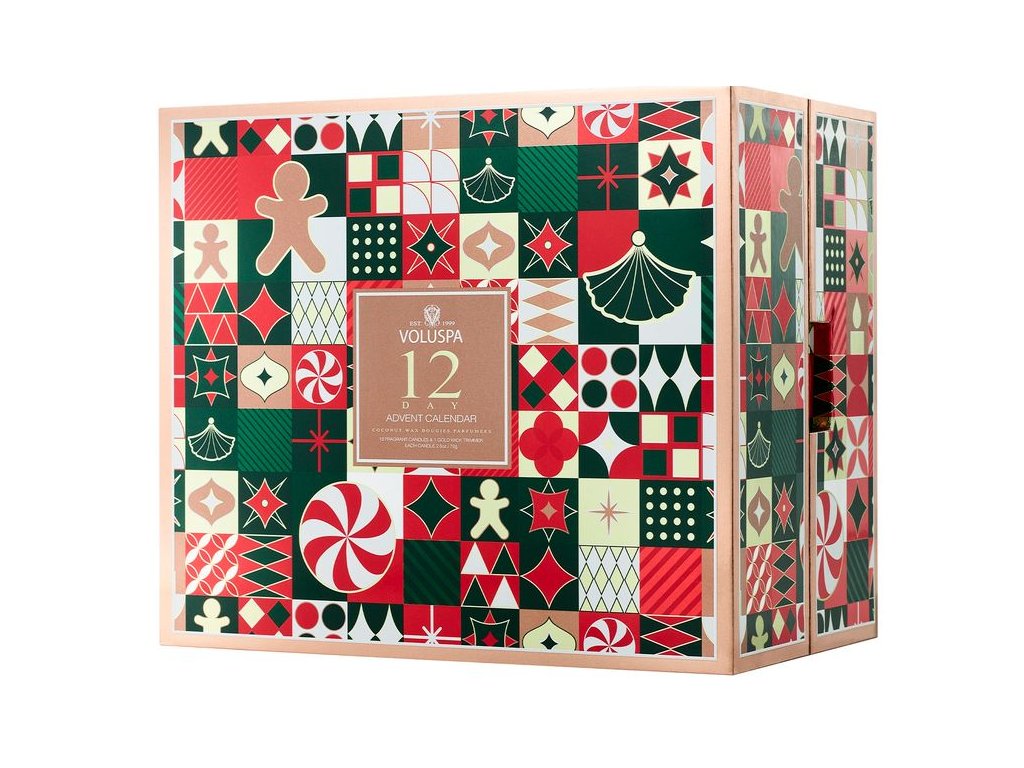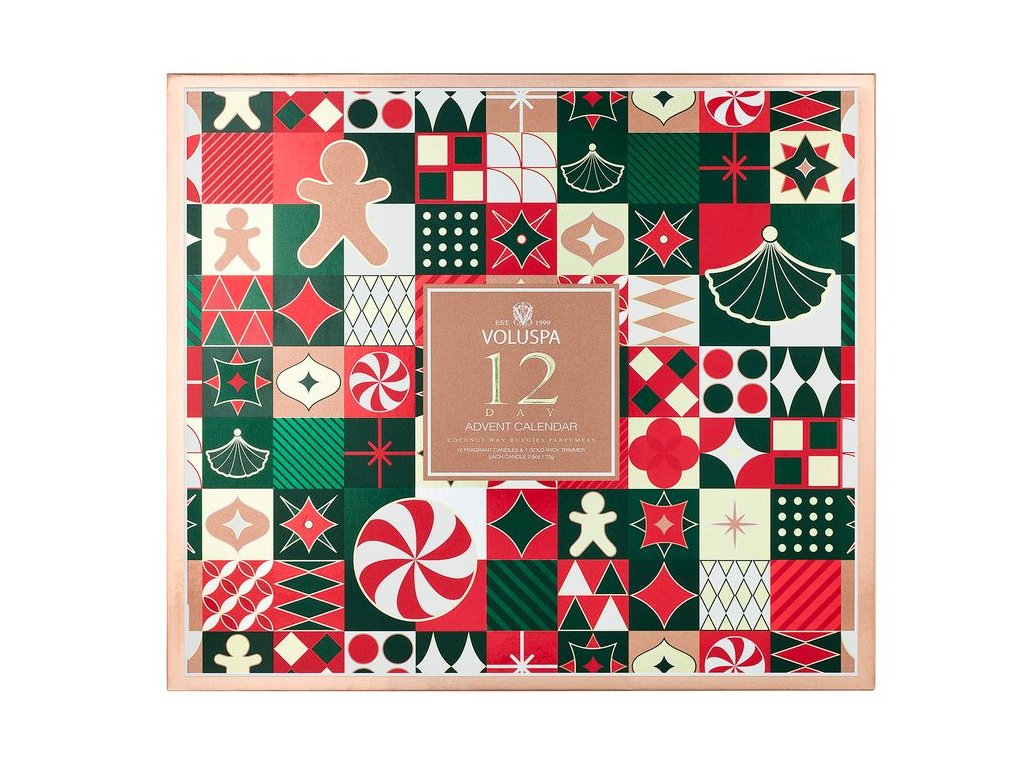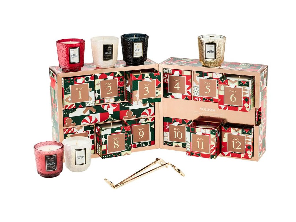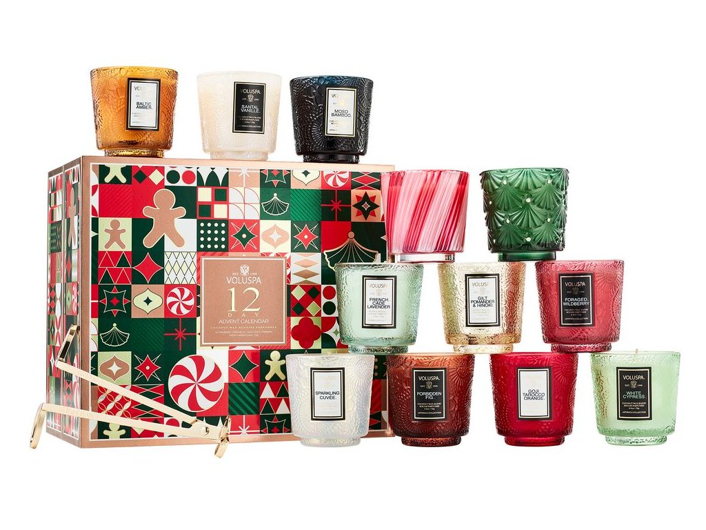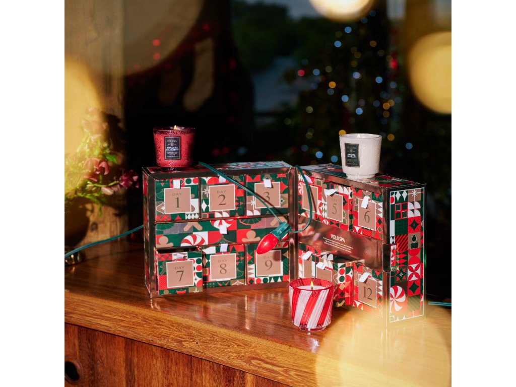 Dovedně sestavená kolekce s 12 denními požitky z nejprodávanějších kolekcí Japonica a Holiday od značky Voluspa. Obsahuje výběr 12 jedinečných vůní, z nichž každá je ukryta v dekorativním skleněném svícnu v různých ozdobných barvách. Součástí jsou zlacené nůžky na knot Voluspa. Každá svíčka hoří 25 hodin.