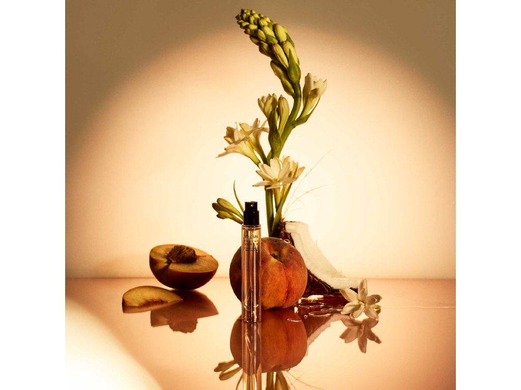 Kompozice spojuje šťavnaté, sluncem políbené broskve s jiskřivým citronem a mandarinkou marigold, které vůni dodávají svěžest a energii. Květinové srdce z frangipani a tuberózy vnáší do celku krémovou smyslnost a jemnou eleganci, jež působí přirozeně a uvolněně, nikoli okázale.
