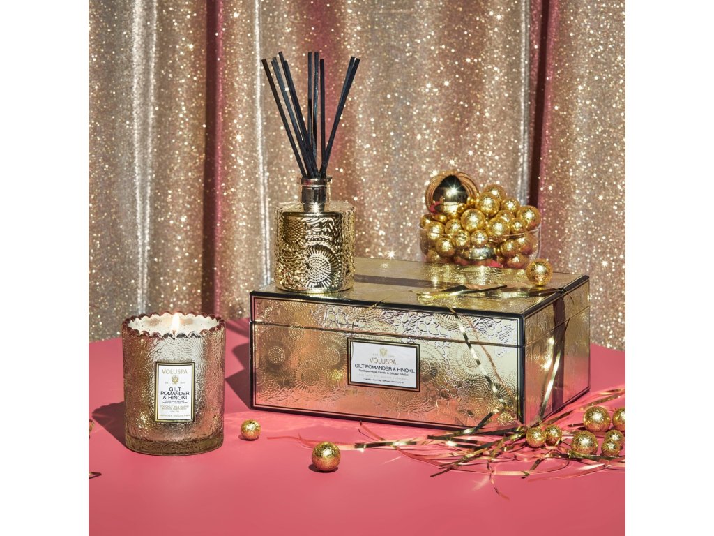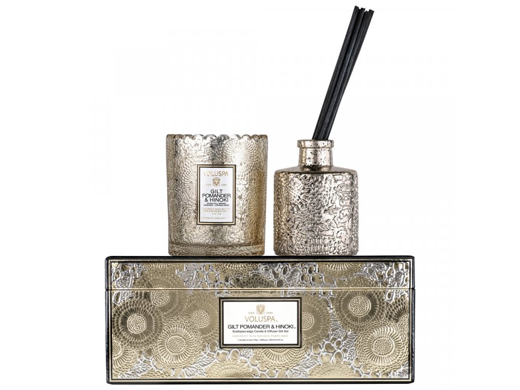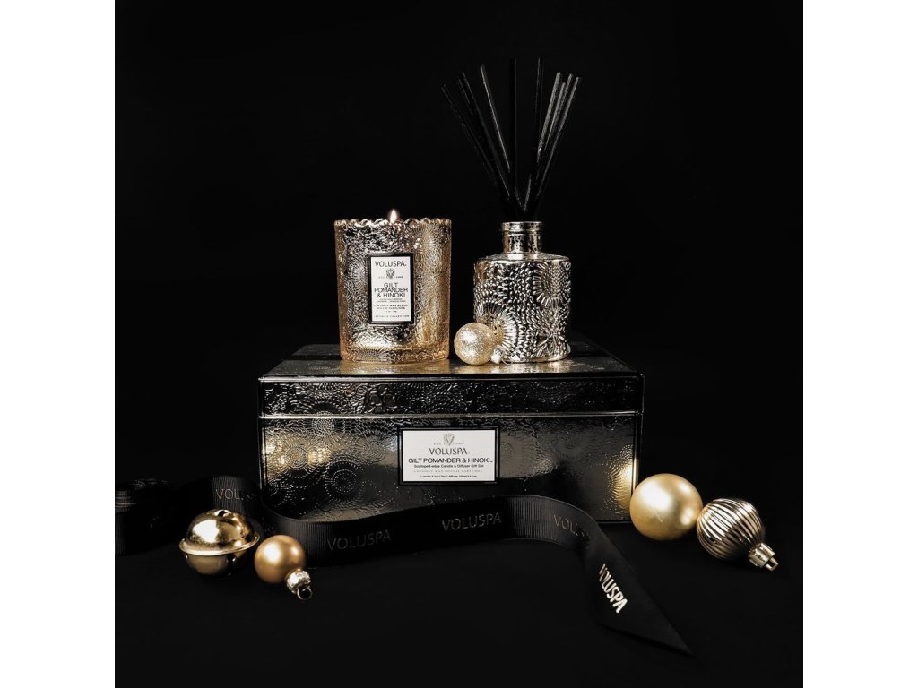 Voluspa - dárkový set svíčka + difuzér JAPONICA GILT POMANDER & HINOKI (Pozlacený pomeranč a cypřišek Hinoki)