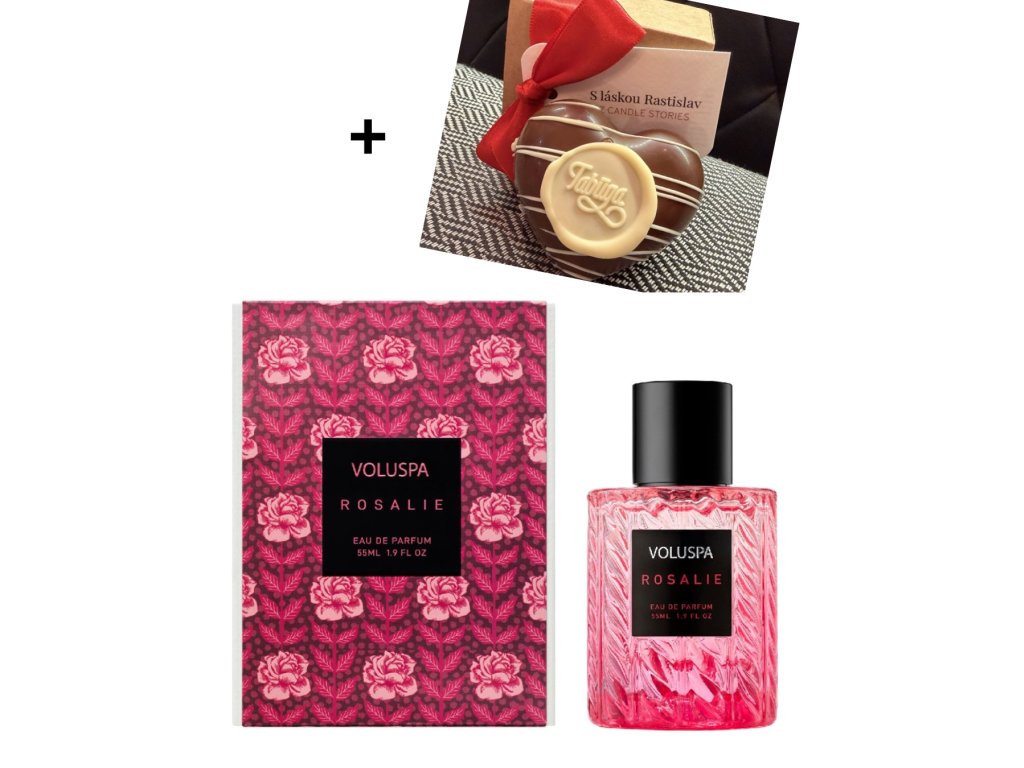 Voluspa - parfém ROSALIE (Růžový pepř, Bulharská růže, maliny) Eau de Parfum 55 ml + čokoládové srdíčko Tabuga (50% Kolumbie, pistácie, kalamansi) 95 g Voluspa - parfém ROSALIE (Růžový pepř, Bulharská růže, maliny) Eau de Parfum 55 ml