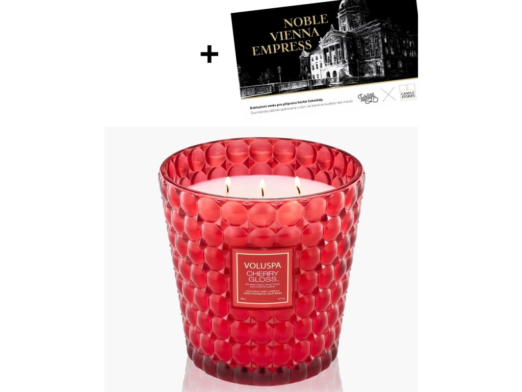 Voluspa - vonná svíčka CHERRY GLOSS (Třešňový lesk) 1077 g + horká čokoláda Tabuxa x Candle Stories - Noble Vienna Empress 250 g