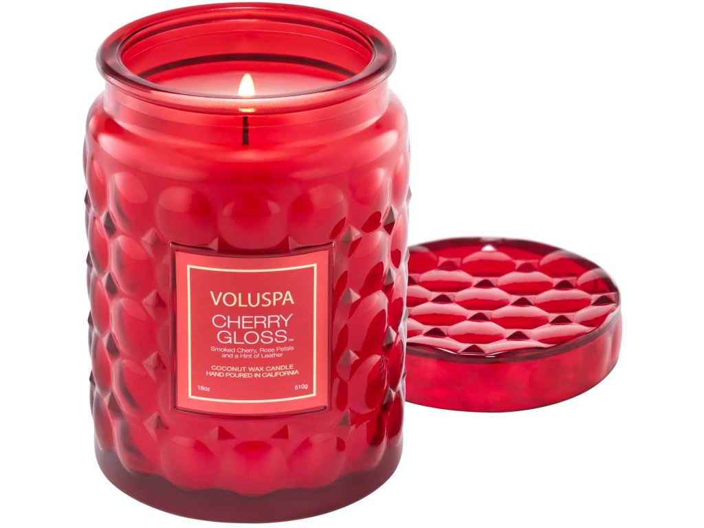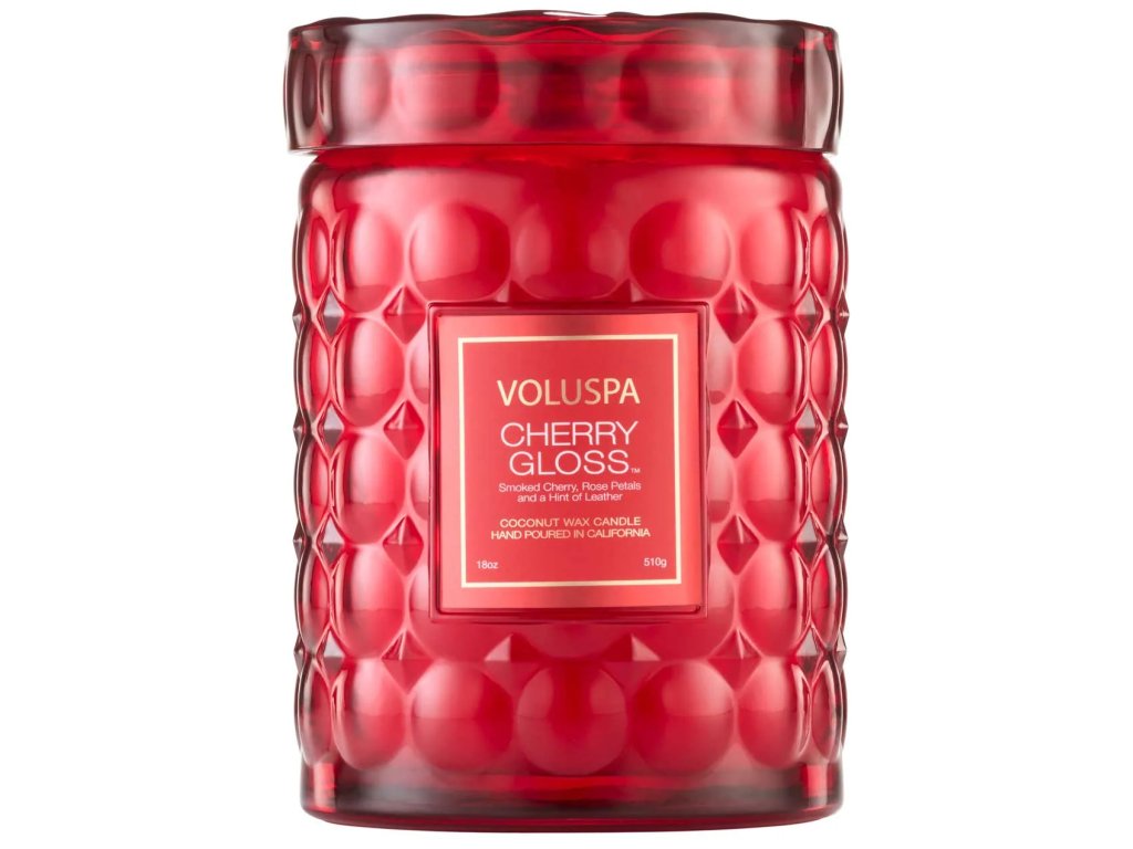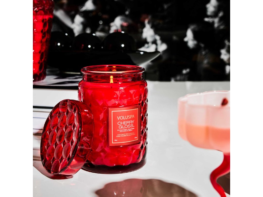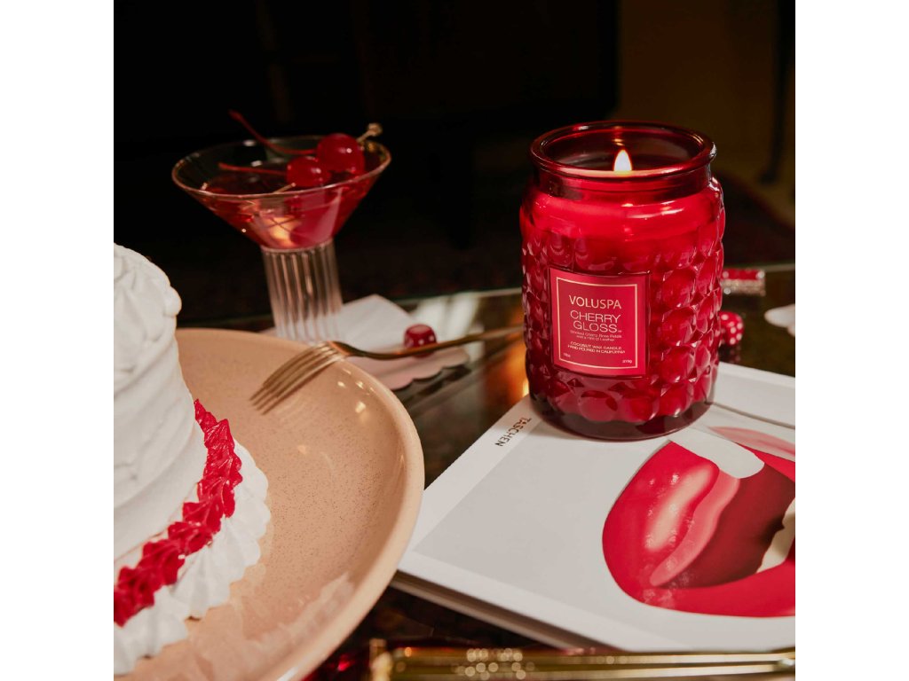 Velká skleněná nádoba s reliéfy odkazující na třešně hravě doplní každý interiér. Designové sklo s embosováním po zapálení vytváří nevšední světelné efekty. Svíčka obsahuje jedinečný blend kokosových vosků, který si značka Voluspa sama míchá a patří mezi nejkvalitnější vosky vůbec. Do nich jsou zality nejkvalitnější přírodní parfémové esence, takže po zapálení svíčka do interiéru rozptýlí vůni v kvalitě luxusního parfému. Velká svíčka Voluspa obsahuje jeden knot, který je výhradně z nejkvalitnější bavlny. Skleněnou nádobu lze po vypálení použít jako elegantní vázu, s víčkem poslouží k uložení čehokoliv.