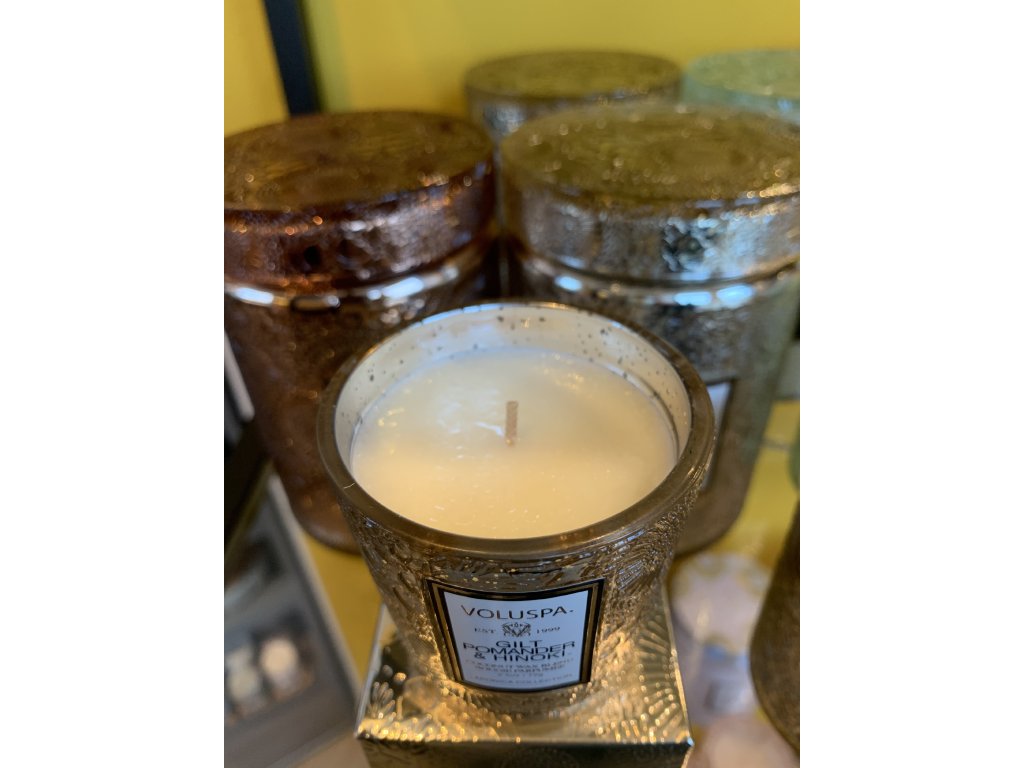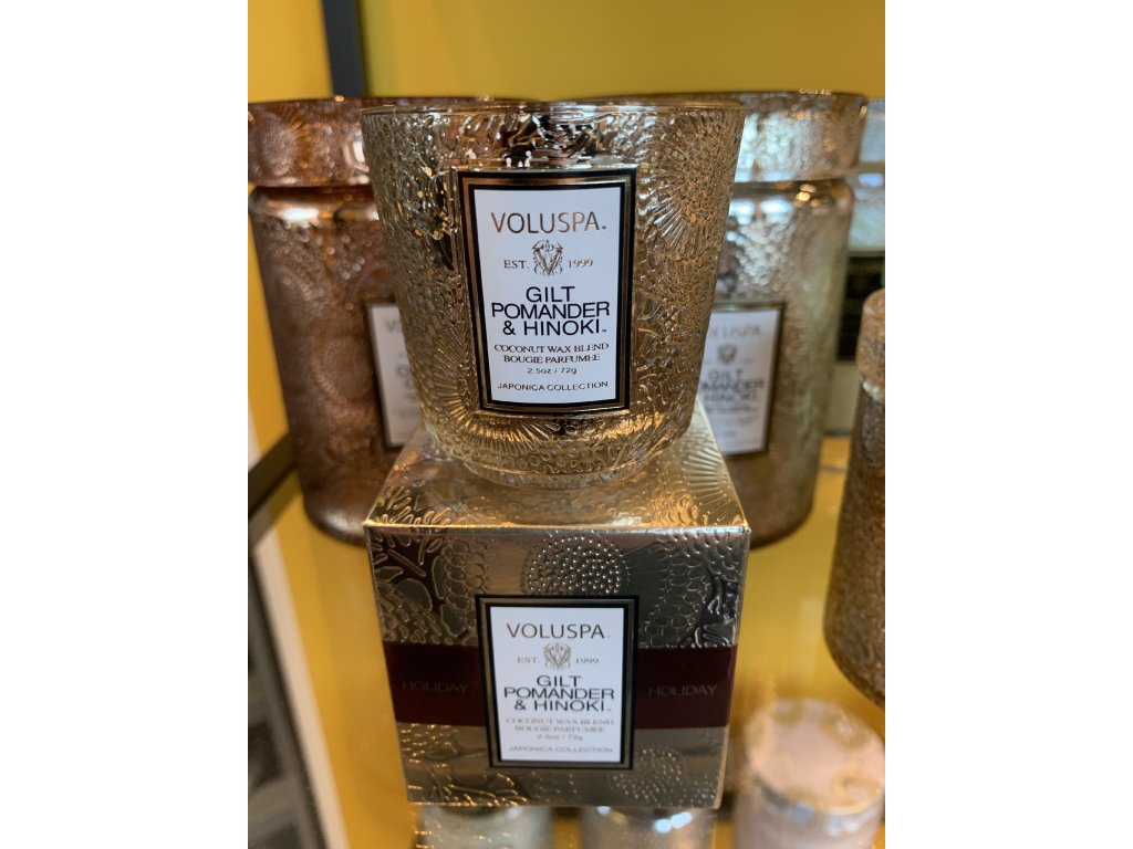 Kořeněná vůně pozlaceného pomanderu (pomander je renesanční šperk, který se nosil na krku a vkládaly se do něho vonné esence), plodů cesmíny, kardamonu a japonského cypřišku Hinoki. Po zapálení se dóza rozzáří stovkami malých hvězdiček. Celosvětový bestseller značky Voluspa.