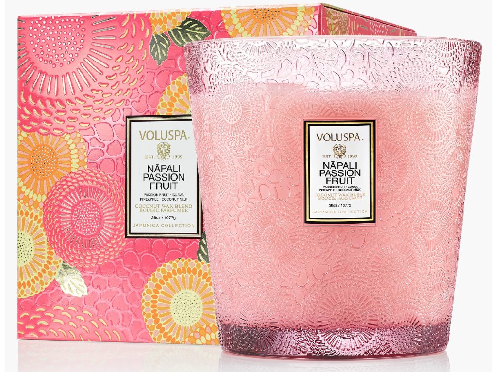 Designové embosované sklo Japonica s květinovými vzory, který odkazuje na ruční výrobu japonského papíru. Svíčka obsahuje jedinečný blend kokosových vosků, který si značka Voluspa sama míchá a patří mezi nejkvalitnější vosky vůbec. Do nich jsou zality nejkvalitnější přírodní parfémové esence, takže po zapálení svíčka do interiéru rozptýlí vůni v kvalitě luxusního parfému. Svíčka obsahuje 3 knoty, které zajistí rovnoměrné hoření. Skleněnou nádobu lze po vypálení použít jako elegantní vázu.