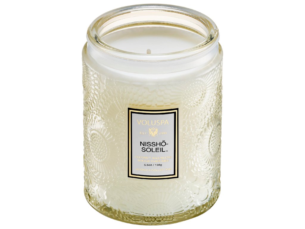 Střední skleněná nádoba s květinovými reliéfy inspirovanými japonskou výrobou papíru krásně doplní každý interiér. Ideální k provonění menších prostor. Designové sklo s embosováním po zapálení vytváří nevšední světelné efekty. Svíčka obsahuje jedinečný blend kokosových vosků, který si značka Voluspa sama míchá a patří mezi nejkvalitnější vosky vůbec. Do nich jsou zality nejkvalitnější přírodní parfémové esence, takže po zapálení svíčka do interiéru rozptýlí vůni v kvalitě luxusního parfému. Střední svíčka Voluspa obsahuje jeden knot, který je výhradně z nejkvalitnější bavlny. Skleněnou nádobu lze po vypálení použít k uložení drobností.