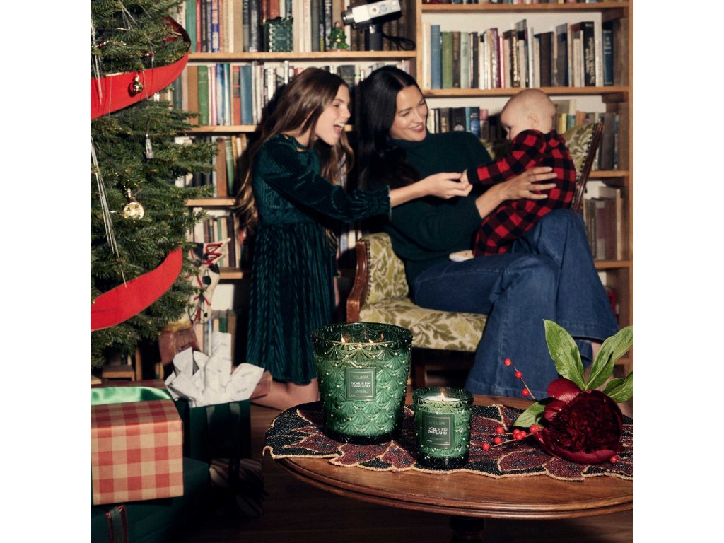 Střední skleněná nádoba s reliéfy vánočního stromečku a zlatých světýlek. Designové sklo s embosováním po zapálení vytváří nevšední světelné efekty. Svíčka obsahuje jedinečný blend kokosových vosků, který si značka Voluspa sama míchá a patří mezi nejkvalitnější vosky vůbec. Do nich jsou zality nejkvalitnější přírodní parfémové esence, takže po zapálení svíčka do interiéru rozptýlí vůni v kvalitě luxusního parfému. Střední svíčka Voluspa obsahuje jeden knot, který je výhradně z nejkvalitnější bavlny. Skleněnou nádobu lze po vypálení použít jako elegantní vázu nebo pro uskladnění drobností.