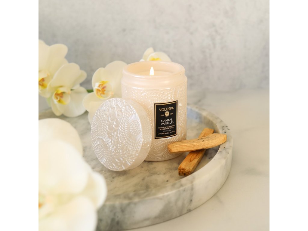 Střední skleněná nádoba s květinovými reliéfy inspirovanými japonskou výrobou papíru krásně doplní každý interiér. Ideální k provonění menších prostor. Designové sklo s embosováním po zapálení vytváří nevšední světelné efekty. Svíčka obsahuje jedinečný blend kokosových vosků, který si značka Voluspa sama míchá a patří mezi nejkvalitnější vosky vůbec. Do nich jsou zality nejkvalitnější přírodní parfémové esence, takže po zapálení svíčka do interiéru rozptýlí vůni v kvalitě luxusního parfému. Střední svíčka Voluspa obsahuje jeden knot, který je výhradně z nejkvalitnější bavlny. Skleněnou nádobu lze po vypálení použít k uložení drobností.
