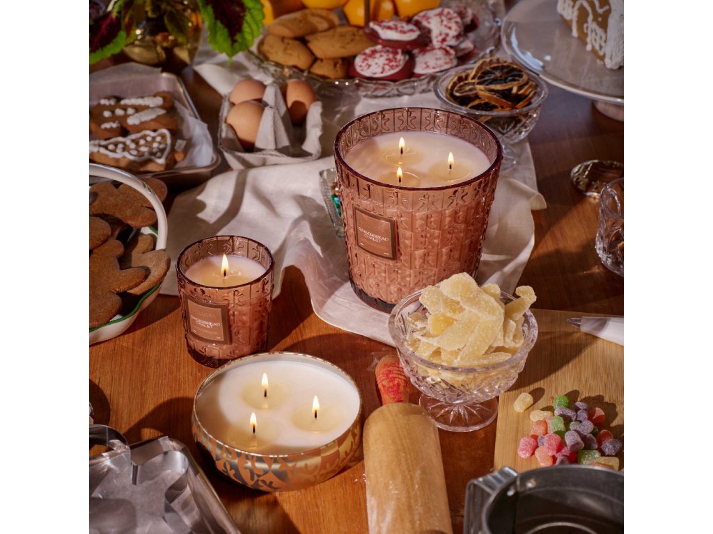 Střední skleněná nádoba s reliéfem perníčků. Designové sklo s embosováním po zapálení vytváří nevšední světelné efekty. Svíčka obsahuje jedinečný blend kokosových vosků, který si značka Voluspa sama míchá a patří mezi nejkvalitnější vosky vůbec. Do nich jsou zality nejkvalitnější přírodní parfémové esence, takže po zapálení svíčka do interiéru rozptýlí vůni v kvalitě luxusního parfému. Střední svíčka Voluspa obsahuje jeden knot, který je výhradně z nejkvalitnější bavlny. Skleněnou nádobu lze po vypálení použít jako elegantní vázu, baleno v dárkové krabičce.